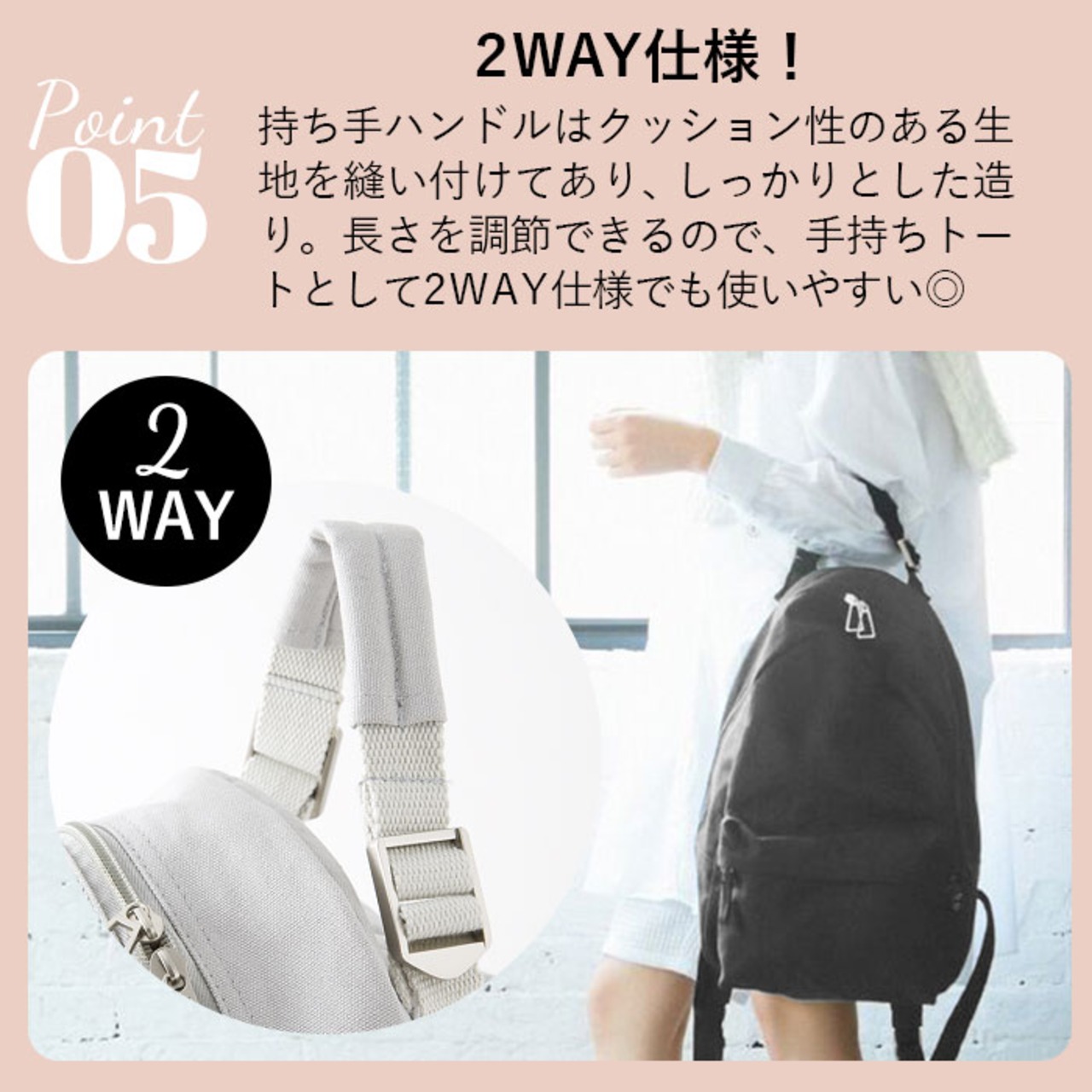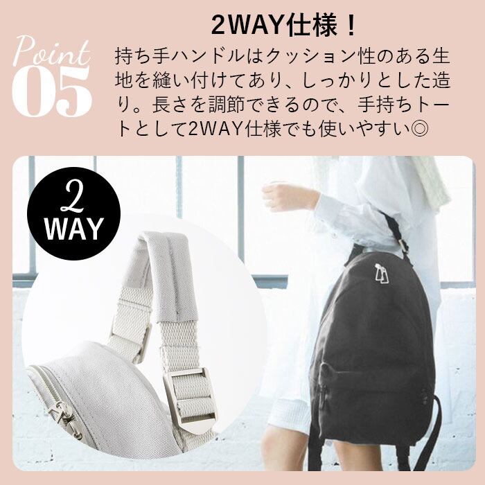 ・持ち手ハンドルはクッション性のある生地を縫い付けてあり、しっかりとした造り。長さを調節できるので、手持ちトートとして2WAYでも使いやすい。