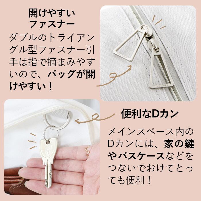 ・メインスペース内、ファスナー開口部近くのDカンには、家の鍵やパスケースなどをつないでおけてとっても便利!