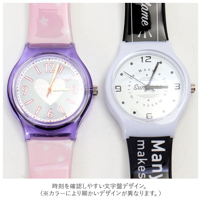 ・パープル1/イエローは、可愛らしいパステルカラーのベルトにクリアカラーの文字盤ケース、ホログラムデザインの文字盤がポイント。