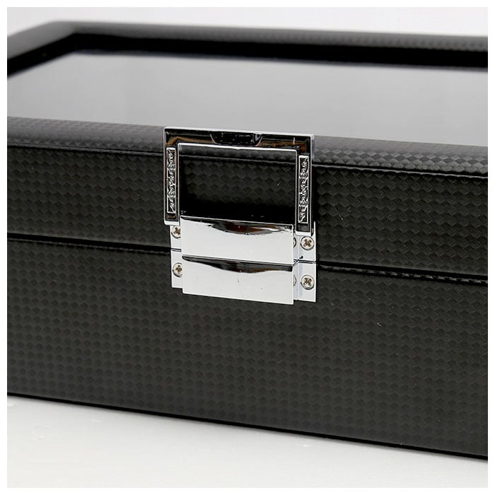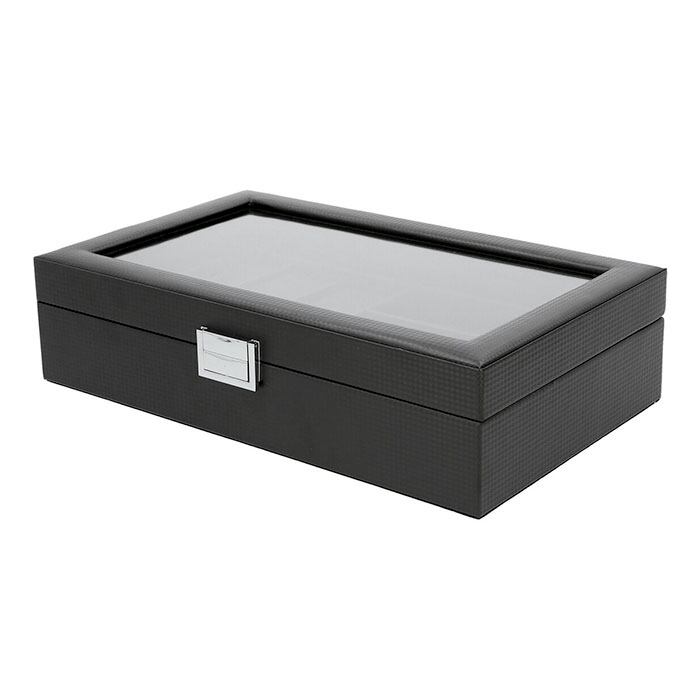 ・ボックスケースの表地は、全面をカーボンファイバーレザーで加工したスタイリッシュなデザイン。上品な光沢が時計やアクセサリーのラグジュアリー感を演出。