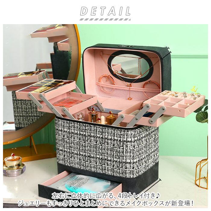 ・左右に立体的に広がる、4段トレイ付き♪ジュエリーもすっきりひとまとめにできるメイクボックスが新登場!