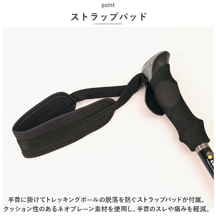 ・手首に掛けてトレッキングポールの脱落を防ぐストラップパッドが付属。クッション性のあるネオプレーン素材を使用し、手首のスレや痛みを軽減。