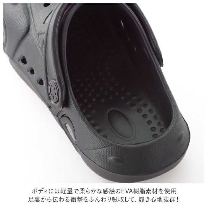 ・ボディには軽量で柔らかな感触のEVA樹脂素材を使用。足裏から伝わる衝撃をふんわり吸収して、履き心地抜群!