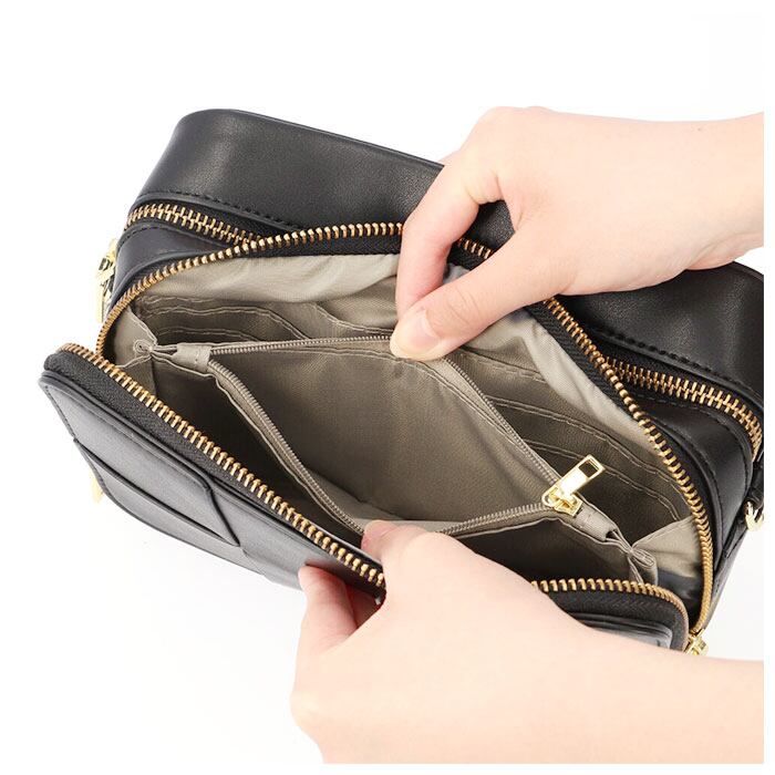・ショルダーベルトは取り外しができ、クラッチバッグやご自宅で細々したものを収納するマルチポーチとしても活躍。