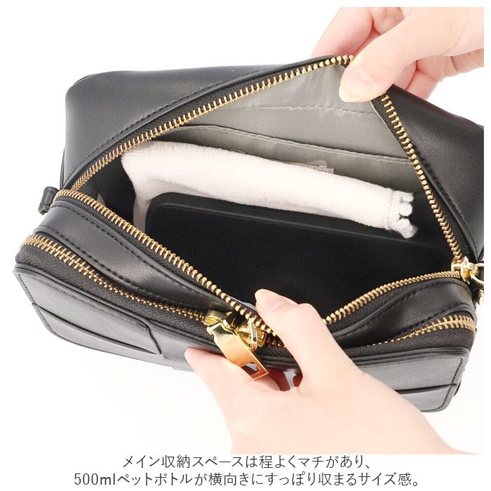 ・メイン収納スペースは程よくマチがあり、500mlペットボトルが横向きにすっぽり収まるサイズ感。スマホやハンカチなどの小物も収納OK。オープンポケット×1付き。