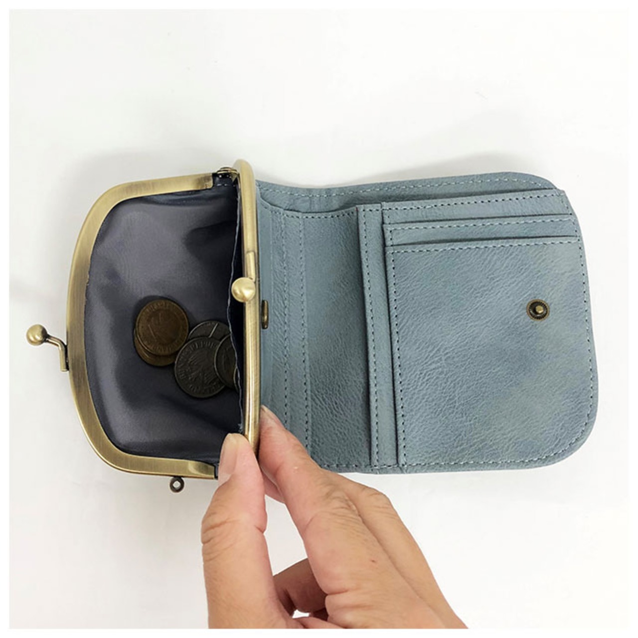 ・コインスペース開口部には昔懐かしいがま口金具を使用し、ワンタッチで開け閉めが楽ちん。内側のコインがひと目で見渡せて、取り出しもスムーズ。