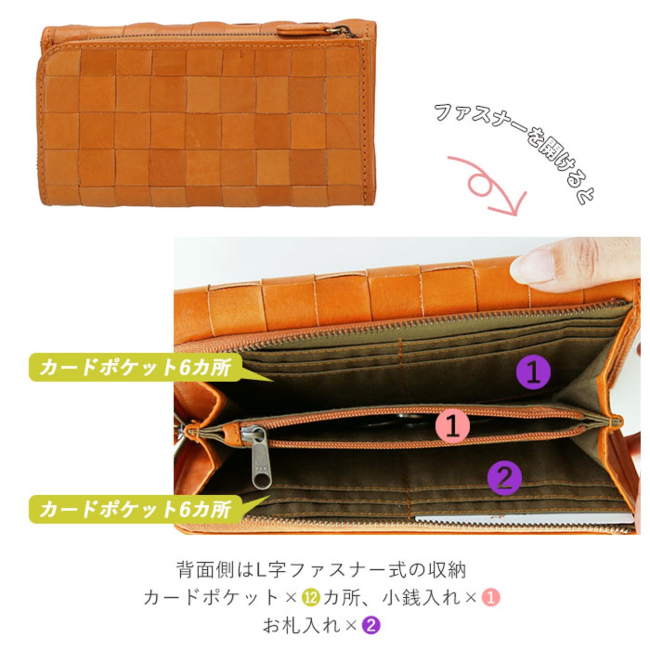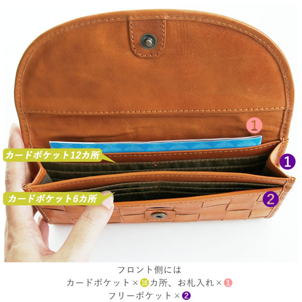 ・前面はフラップ式、背面はL字ファスナー式の収納になっていて、前後どちらからでも開閉が可能。前面はフラップ式で大きく開く。内部にはカードポケット×18か所、お札入れ×1か所、フリーポケット×2か所。背面のファスナーを開けると、小銭入れ×1か所、お札入れ×2か所、カードポケット12か所と大容量。カードが前後合わせて30枚も収納可能。