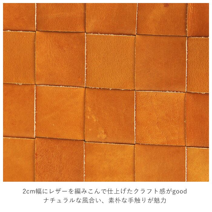・編み込んだ革のフチにステッチを施しており、おしゃれで頑丈な作り。2cmの幅にカットされたレザーを手編みで編みこんで仕上げたクラフト感がgood。