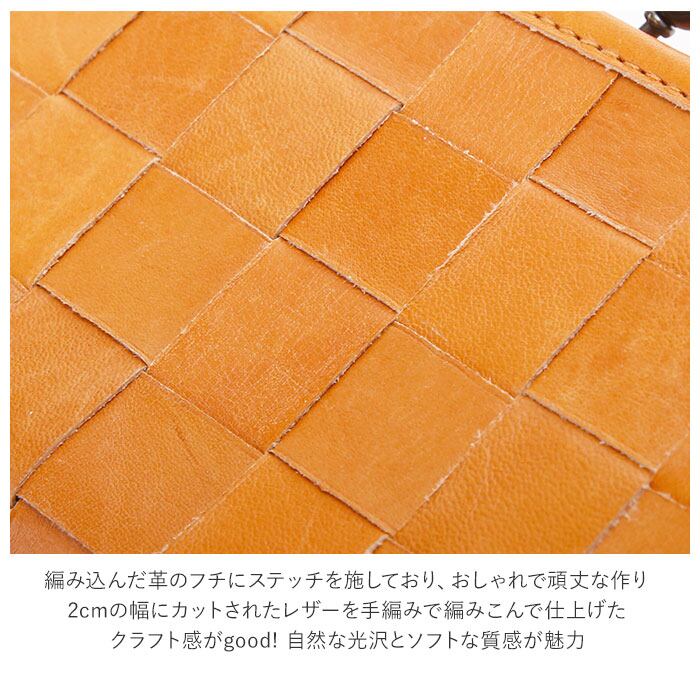 ・編み込んだ革のフチにステッチを施しており、おしゃれで頑丈な作り。2cmの幅にカットされたレザーを手編みで編みこんで仕上げたクラフト感がgood。