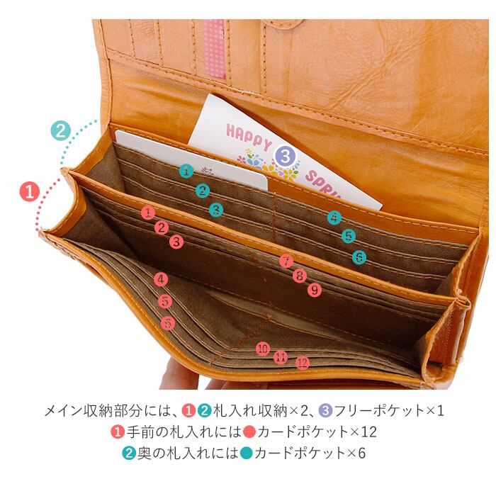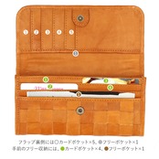 ・前面はフラップ式、背面はがま口という仕様。フラップを開いて下側には、札入れ収納×2、フリー収納×2。一番手前のフリー収納には、カードポケット×4、フリーポケット×1。手前の札入れにはカードポケット×12。奥の札入れにはカードポケット×6。フラップ上側にはカードポケット×5、裏側はフリー収納になっていて大容量。