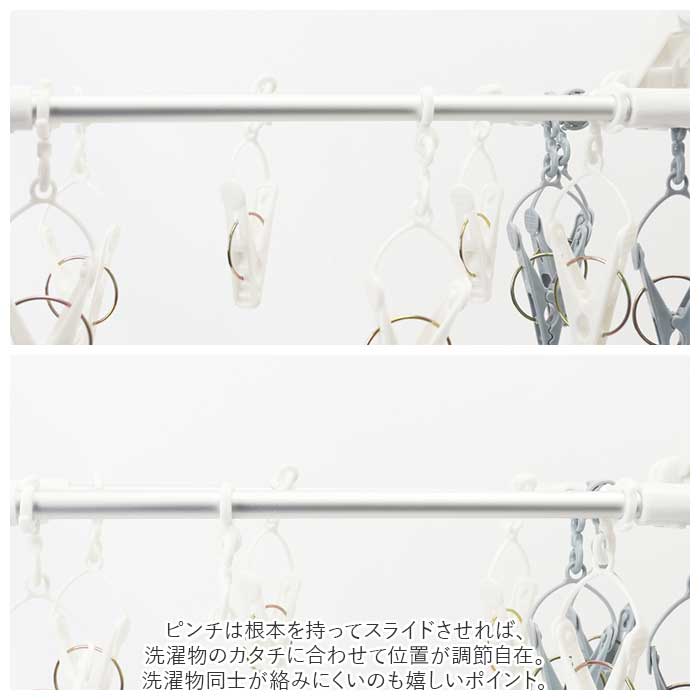 ・ピンチは根本を持ってスライドさせれば、洗濯物のカタチに合わせて位置が調節自在。洗濯物同士が絡みにくいのも嬉しいポイント。