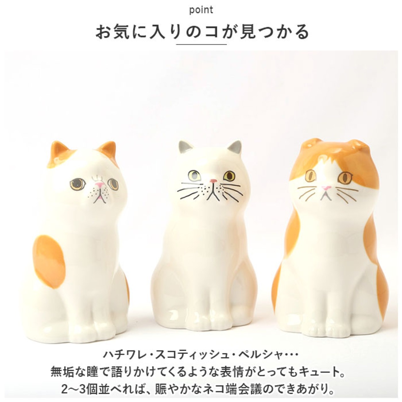 ・ハチワレ・スコティッシュ・ペルシャ・・・無垢な瞳で語りかけてくるような表情がとってもキュート。2〜3個並べれば、賑やかなネコ端会議のできあがり。