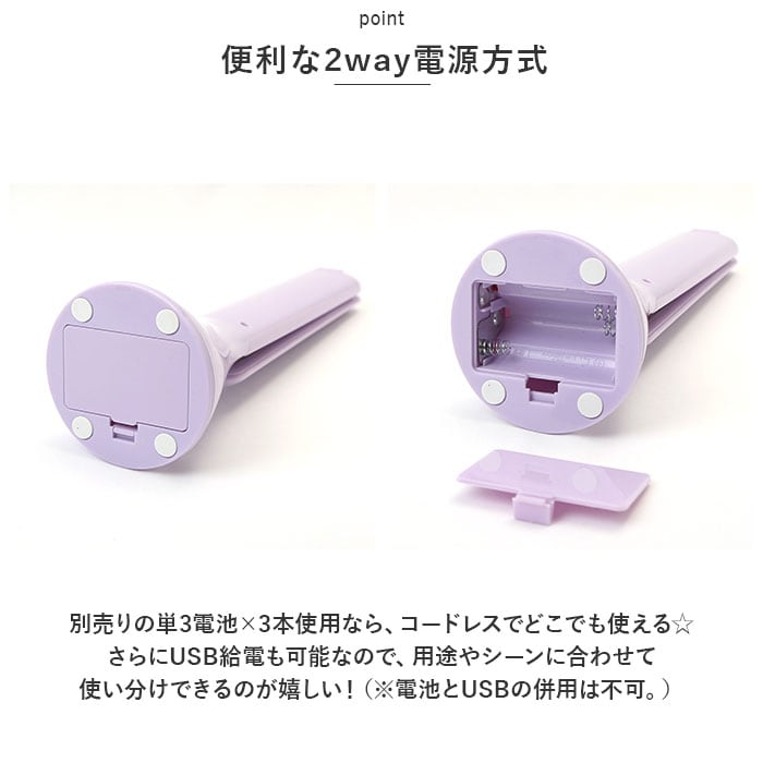 ・別売りの単3電池×3本使用なら、コードレスでどこでも使える☆さらにUSB給電も可能なので、用途やシーンに合わせて使い分けできるのが嬉しい!(※電池とUSBの併用は不可。)