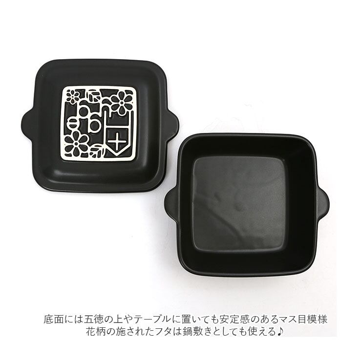 ・底面には五徳の上やテーブルに置いても安定感のあるマス目模様。花柄の施されたフタは鍋敷きとしても使える、機能性とデザインが調和した無駄のないフォルムにも注目。