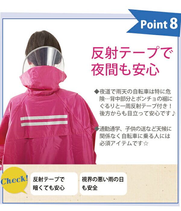 自転車専用設計で突然の雨でも安心!PVC防水コーティングのポンチョレインコート!素材は防水性、耐摩耗性に優れた素材を使用し、表面には撥水加工、縫い目には防水加工を施しています。また、レインウェアに適度な厚みや重量を持たせることで、風の強い日や豪雨の時に、レインウェアが体にまとわりついたり、捲りあがるのを防ぎます。 透明な大きめのつばを採用し、雨にぬれにくく視界を遮らないので安心安全に運転できます。レインコート周囲と背面には反射テープを施し、夜間でも安心安全にご利用頂けます。