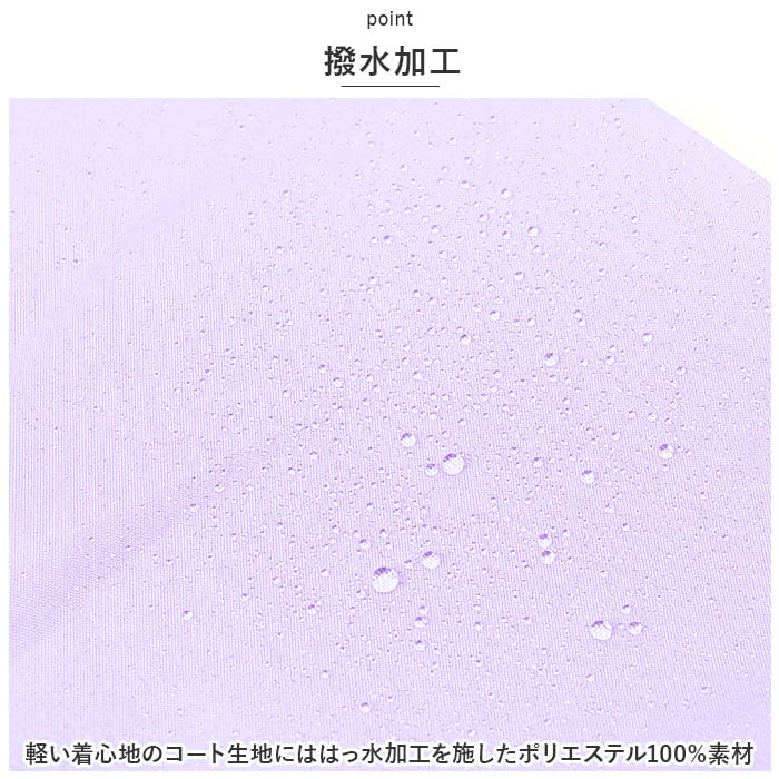 ・軽い着心地のコート生地にははっ水加工を施したポリエステル100%素材を採用し、雨のしずくからお子さまの身体をしっかりガード!(※完全防水仕様ではありません。)