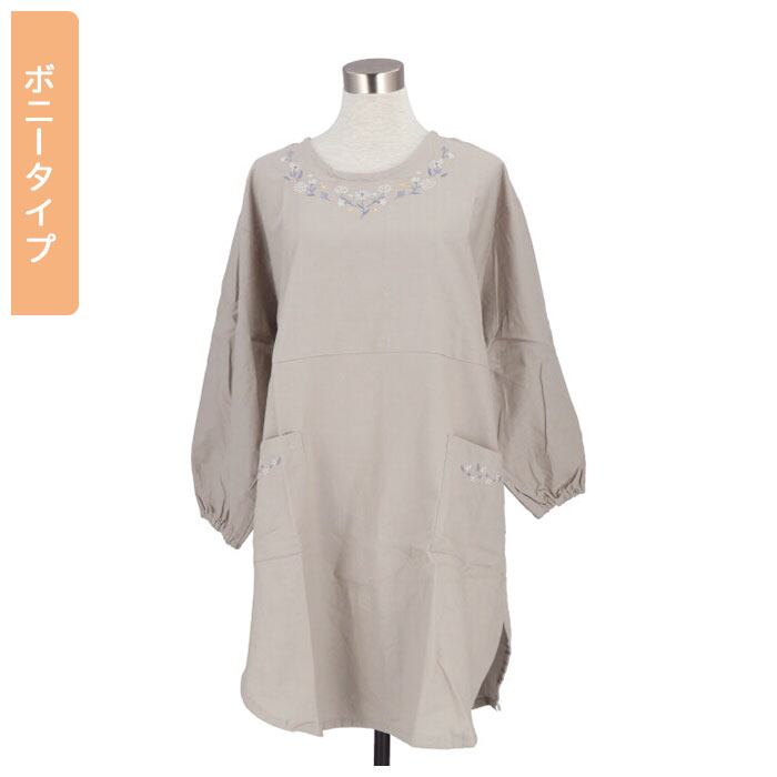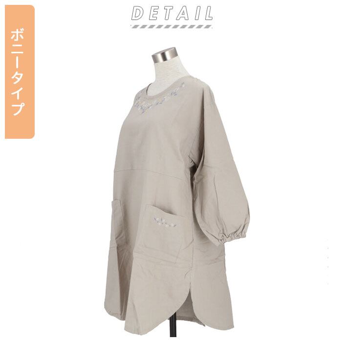 ・ベースには無地の生地を使用し、胸元やポケットに散りばめた花の刺繍柄が可愛らしいシンプルなデザイン。