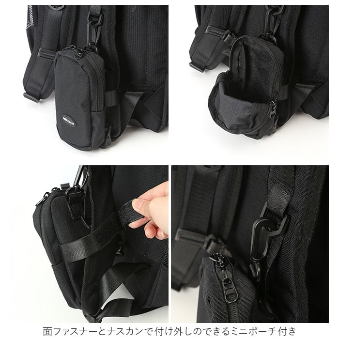 ・面ファスナーとナスカンで付け外しのできるミニポーチ付き。