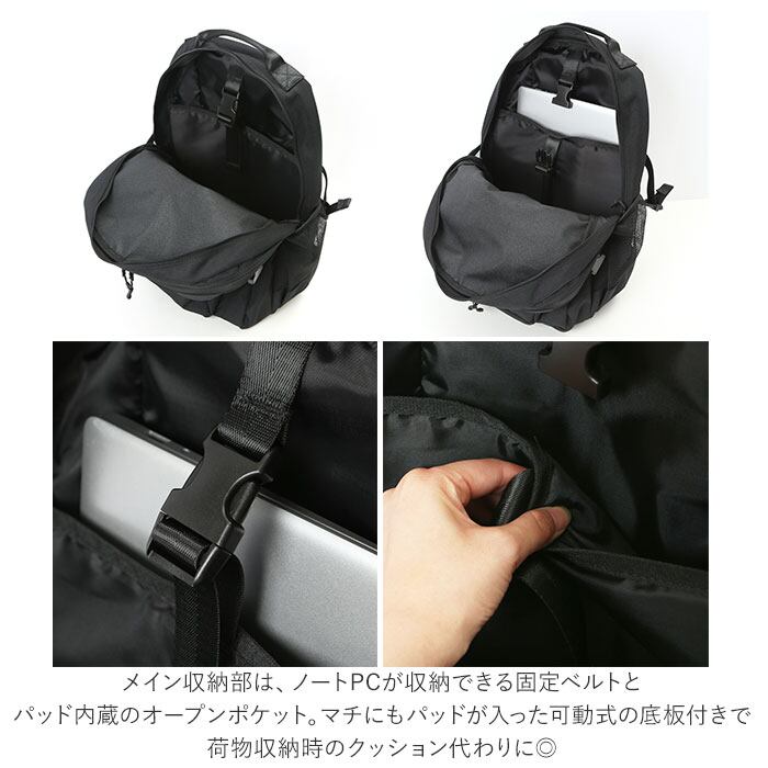 ・メイン収納部は、ノートPCが収納できる固定ベルトとパッド内蔵のオープンポケット。マチにもパッドが入った可動式の底板付きで荷物収納時のクッション代わりに◎。