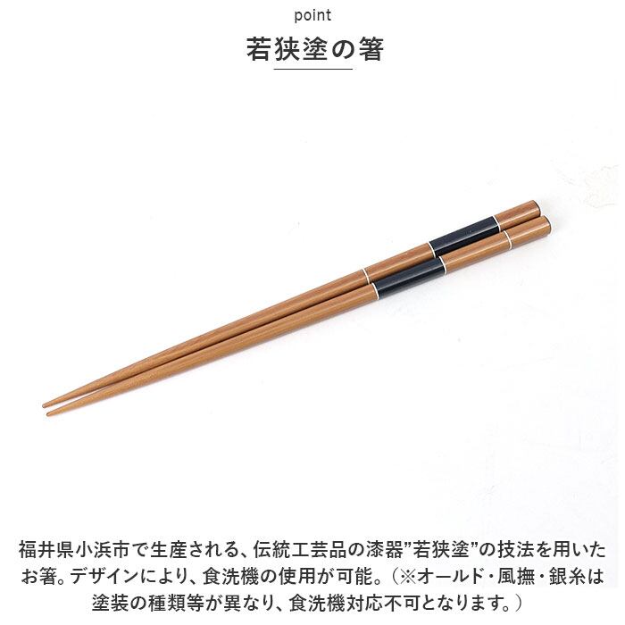 ・福井県小浜市で生産される、伝統工芸品の漆器”若狭塗”の技法を用いたお箸。デザインにより、食洗機の使用が可能。(※オールド・風撫・銀糸は塗装の種類等が異なり、食洗機対応不可となります。)
