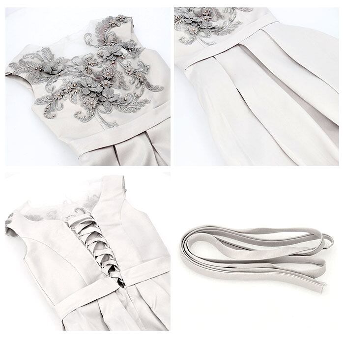・上身頃部分に取り入れた、レース素材やフラワーモチーフの刺繍デザインがアクセント。