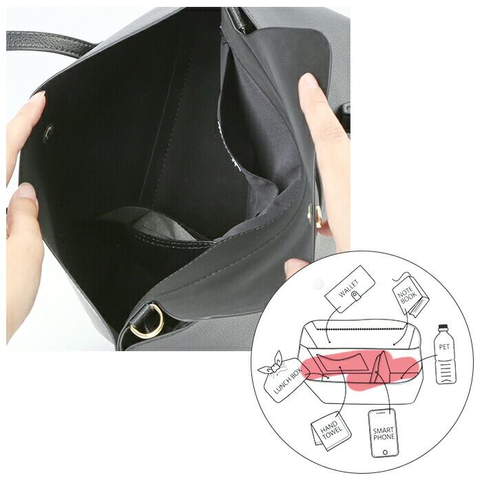 ・ダブルメイン収納で、お弁当やB5サイズの書類などの大きな持ち物と、パスケースのような細かい持ち物を分けて収納することが可能。