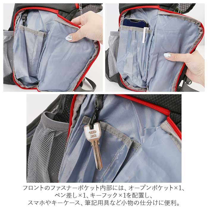 ・フロントのファスナーポケット内部には、オープンポケット×1、ペン差し×1、キーフック×1を配置し、スマホやキーケース、筆記用具など小物の仕分けに便利。(※スマートフォンのサイズにより、オープンポケット内に収納できな場合がございます。)