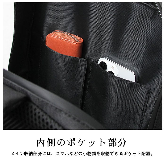 ・さらにスマホやメガネケースサイズのオープンポケットも2ヶ所設け、細々とした小物類もすっきりと定位置に。