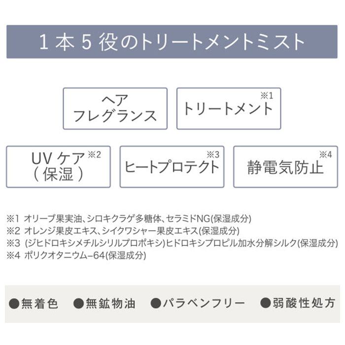 ・これ1本でヘアフレグランス、トリートメント、UVケア(保湿)、静電気防止、ヒートプロテクトの5役を果たしてくれるトリートメントミスト。