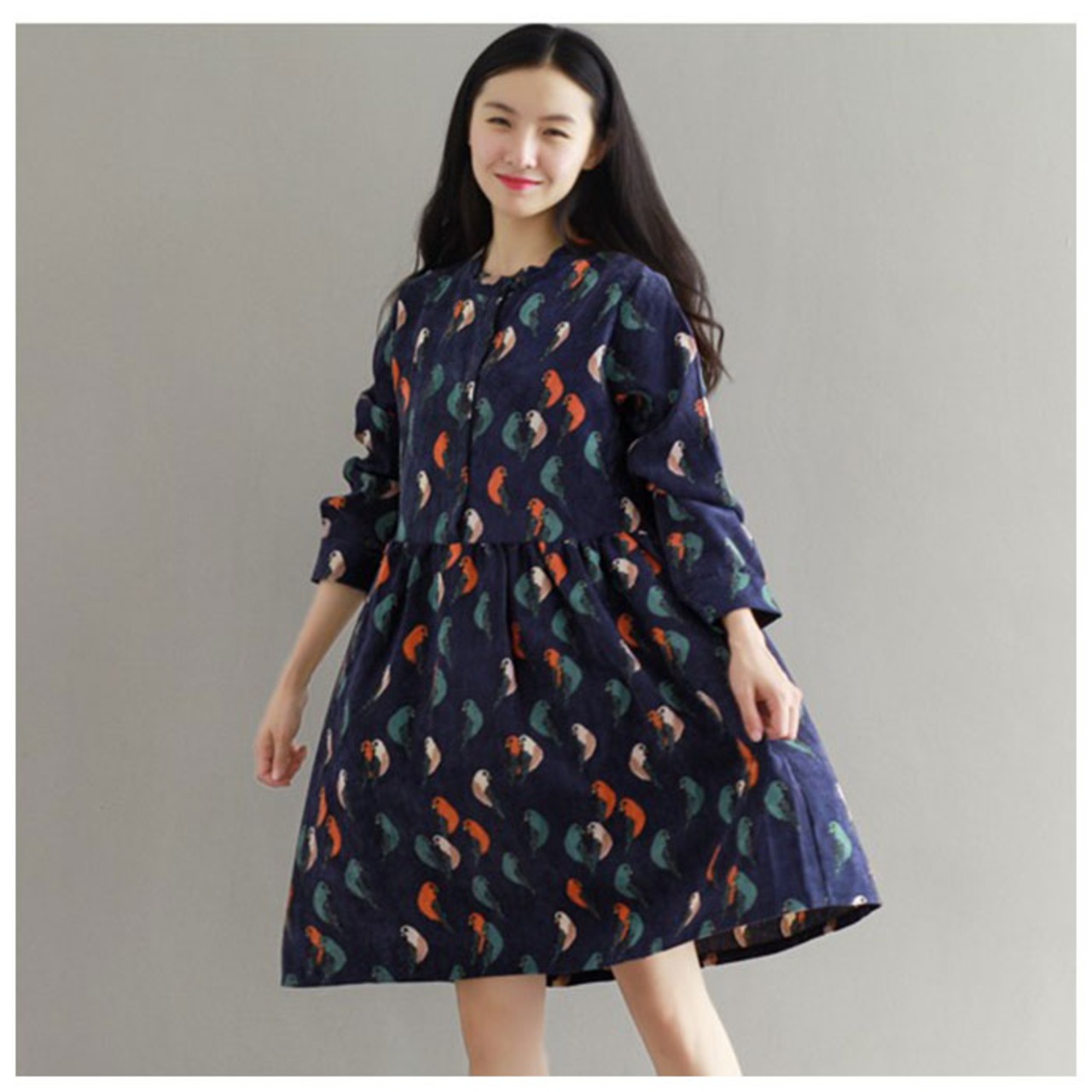 ・鳥柄のプリントが可愛らしい長袖ワンピースが新登場。