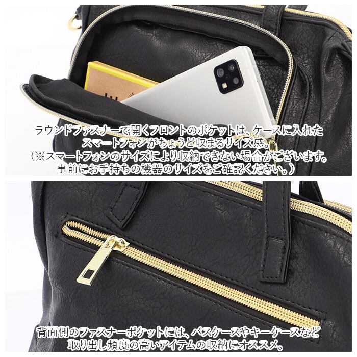 ・ラウンドファスナーで開くフロントのポケットは、ケースに入れたスマートフォンがちょうど収まるサイズ感。(※スマートフォンのサイズにより収納できない場合がございます。事前にお手持ちの機器のサイズをご確認ください。)
