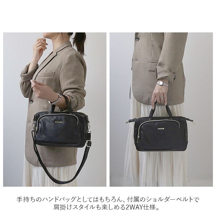 ・手持ちのハンドバッグとしてはもちろん、付属のショルダーベルトで肩掛けスタイルも楽しめる2WAY仕様。