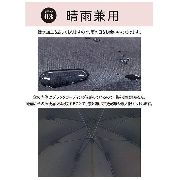 ・傘生地の内側にはブラックコーティングを施し、紫外線はもちろん、地面からの照り返しも吸収し、赤外線や可視光線もカット!