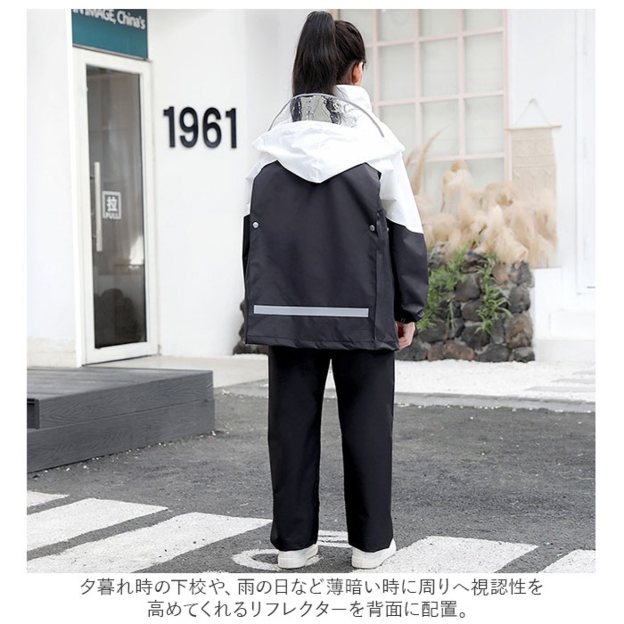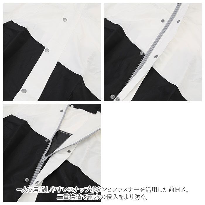 ・一人で着脱しやすいスナップボタンとファスナーを活用した前開き。二重構造で雨水の侵入をより防ぐ。