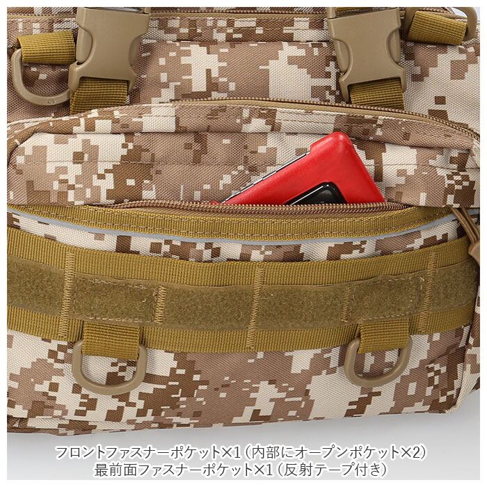 ・マチ付きのフロントポケットは貴重品やスマホ入れに最適。反射材テープ付きで夜間