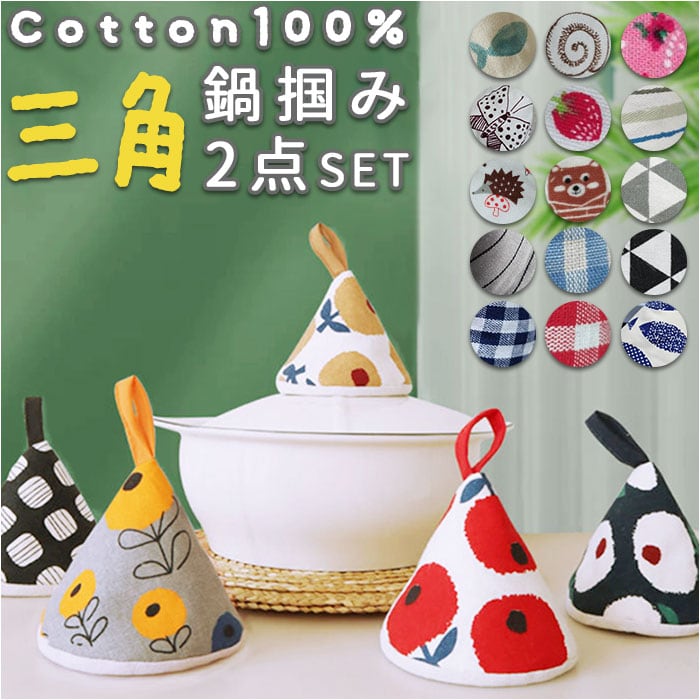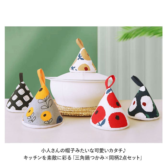 ・小人さんの帽子みたいな可愛いカタチ♪キッチンを素敵に彩る「コットン 三角鍋つかみ×同柄2点セット」