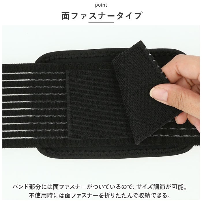 ・バンド部分には面ファスナーがついているので、サイズ調節が可能。不使用時には面ファスナーを折りたたんで収納できる。