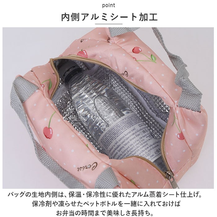 ・バッグの生地内側は、保温・保冷性に優れたアルム蒸着シート仕上げ。保冷剤や凍らせたペットボトルを一緒に入れておけば、お弁当の時間まで美味しさ長持ち。