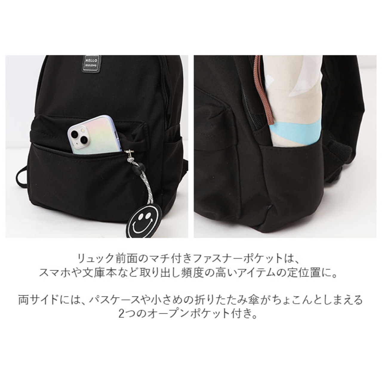 ・リュック前面のマチ付きファスナーポケットは、スマホや文庫本など取り出し頻度の高いアイテムの定位置に。