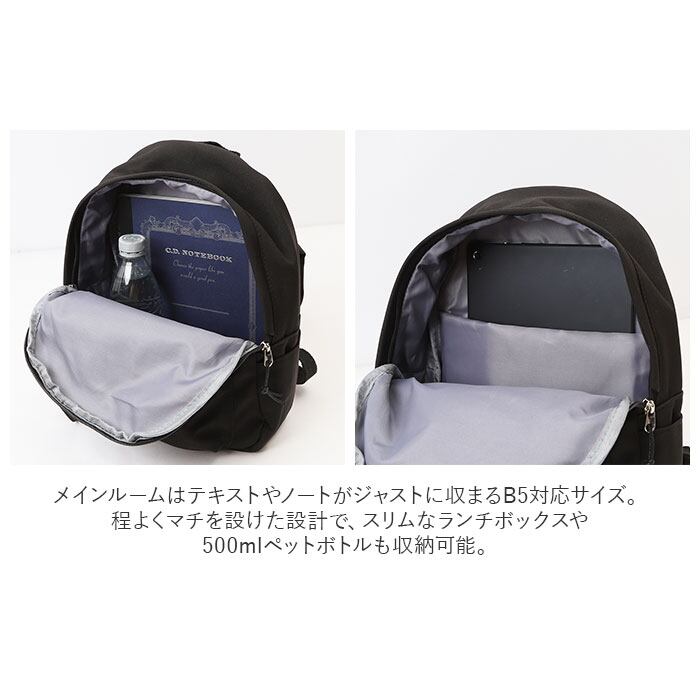 ・メインルームはテキストやノートがジャストに収まるB5対応サイズ。程よくマチを設けた設計で、スリムなランチボックスや500mlペットボトルも収納可能。