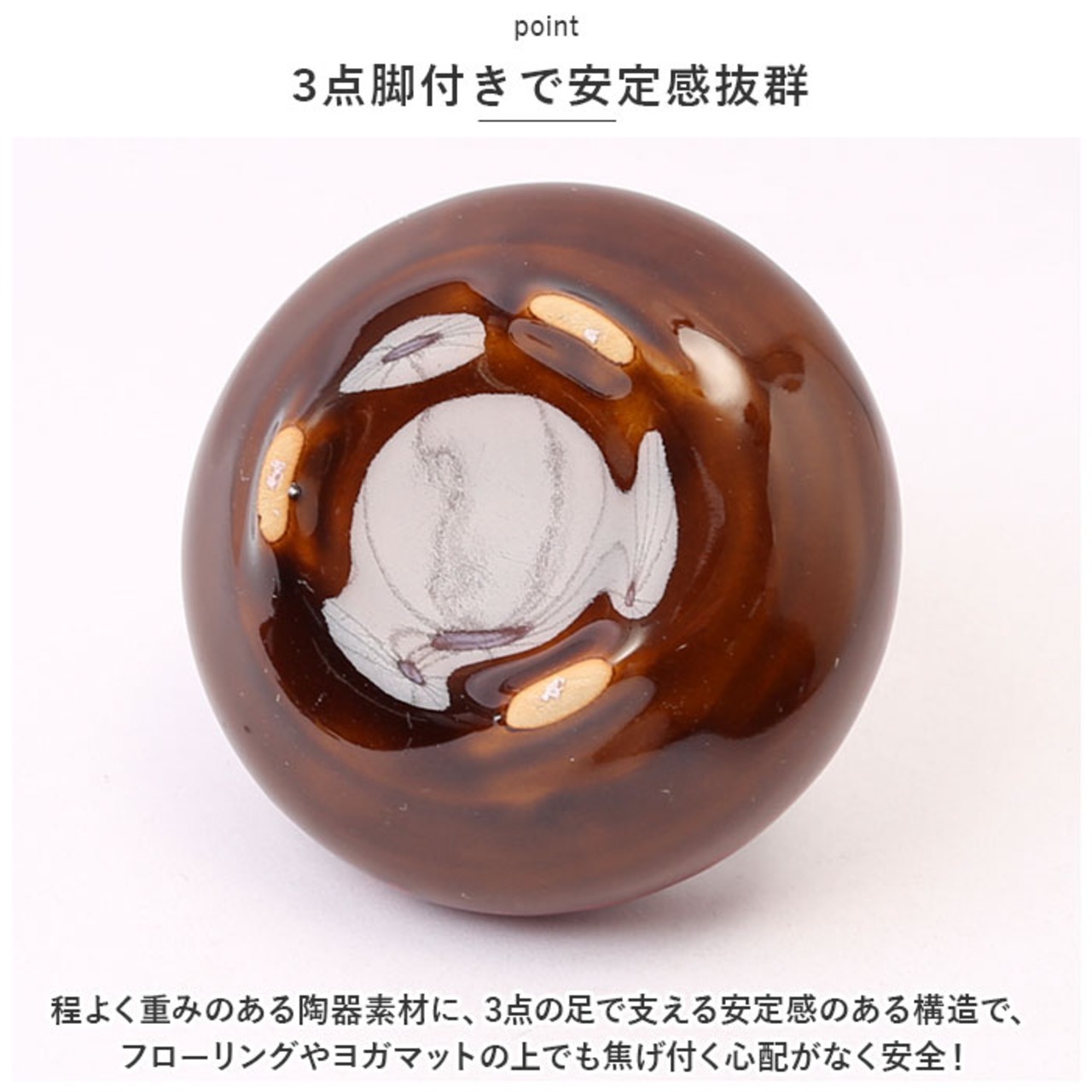 ・程よく重みのある陶器素材に、3点の足で支える安定感のある構造で、フローリングやヨガマットの上でも焦げ付く心配がなく安全!