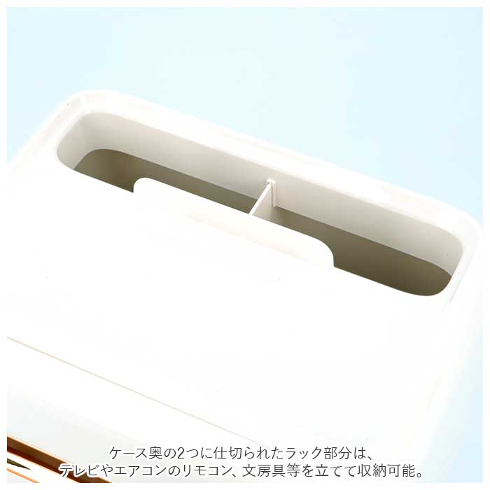 ・ケース奥の2つに仕切られたラック部分は、テレビやエアコンのリモコン、文房具等を立てて収納可能。