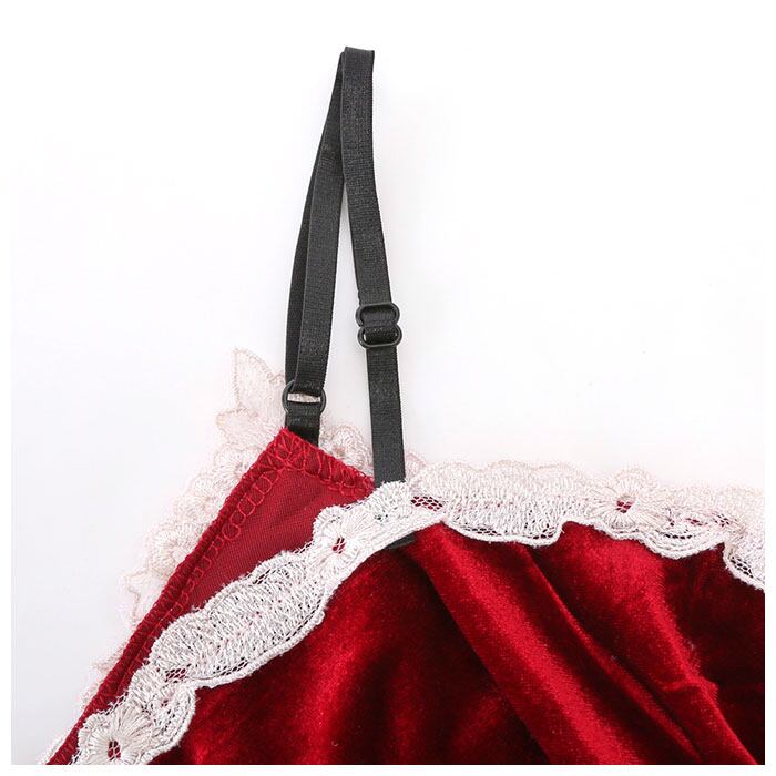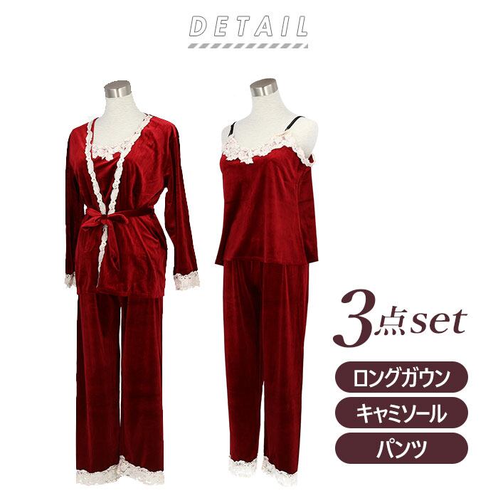 ・キャミソールの胸元やパンツの裾に配されたレースが可愛い♪柔らかな肌触りのベルベット素材を使用。巣ごもりタイムをゴージャスに彩る♪