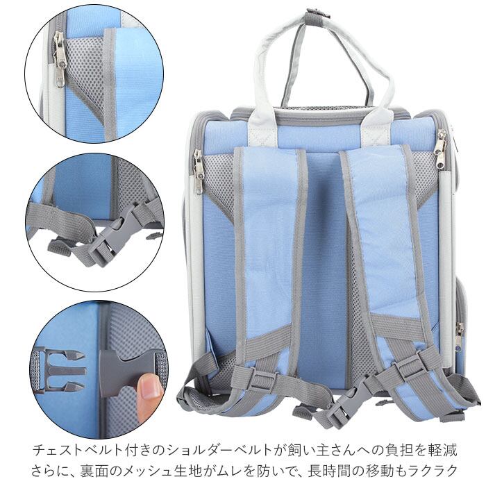 ・チェストベルト付きのショルダーベルトが飼い主さんへの負担を軽減。さらに、裏面のメッシュ生地がムレを防いで、長時間の移動もラクラク。