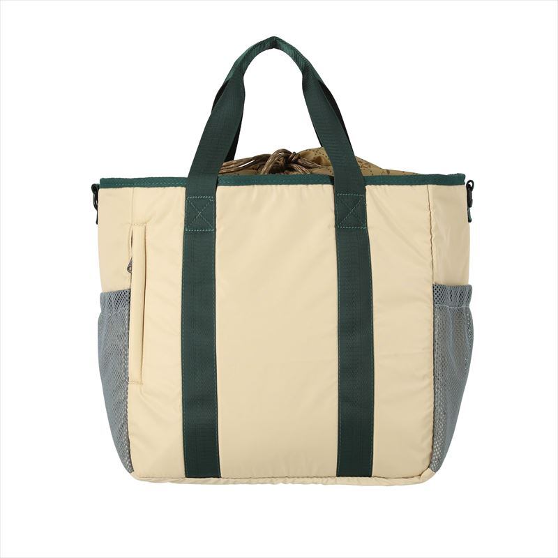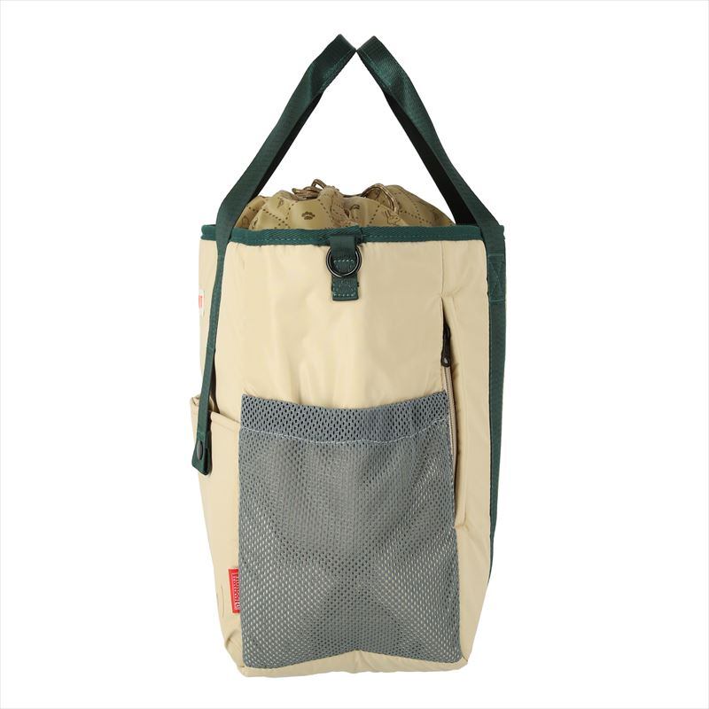 ・ボンディング加工が施されており、ふんわり軽い。体に寄り添うやわらかさがありながら、カッチリした雰囲気。自立性があり、入り口が大きく開くため、中の荷物の出し入れはスムーズです。口元巾着で中身が見えず安心。