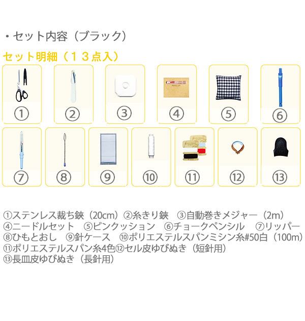 【ブラック】ステンレス裁ちはさみ(20cm 右利き用のみ)、糸切りはさみ(11.5cm)、自動巻メジャー2m、ニードルセット、ピンクッション、チョークペンシル、リッパー、ひもとおし、針ケース、ポリエステルスパンミシン糸#50白(100m)、ポリエステルスパン糸4色、セル皮ゆびぬき(短針用)、長皿皮ゆびぬき(長針用)