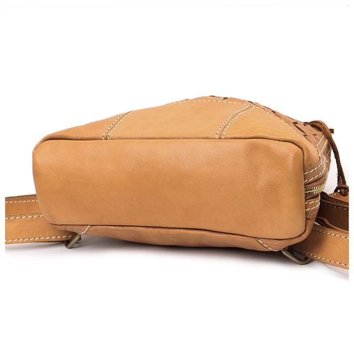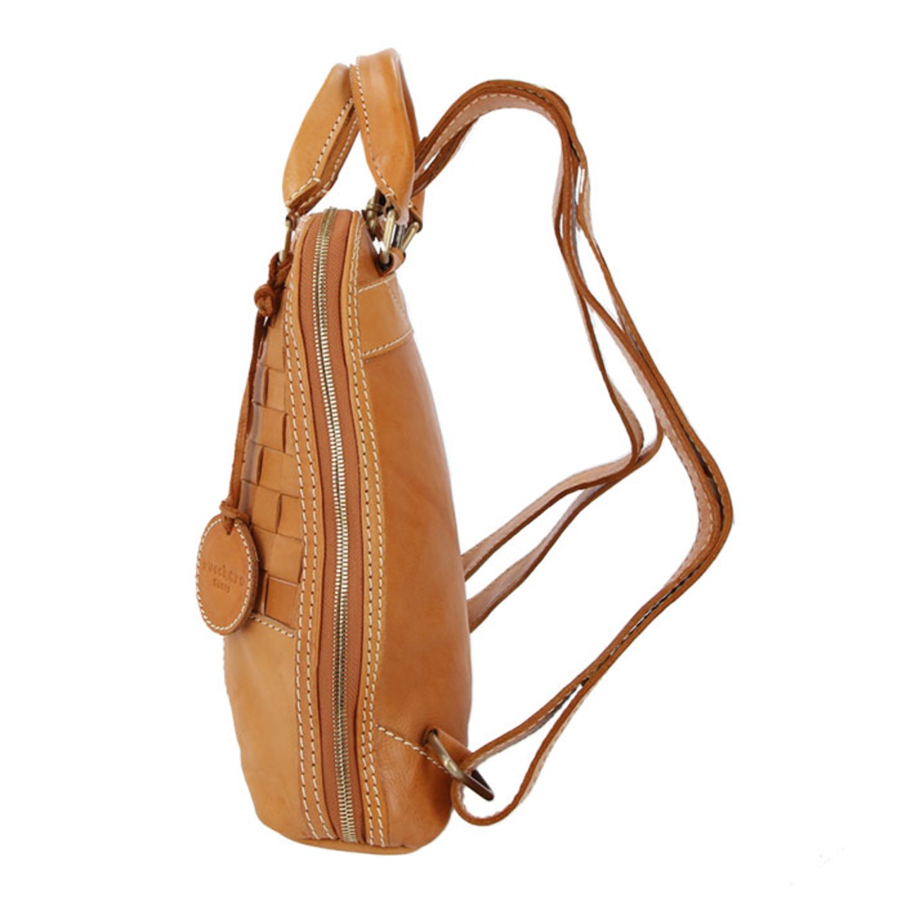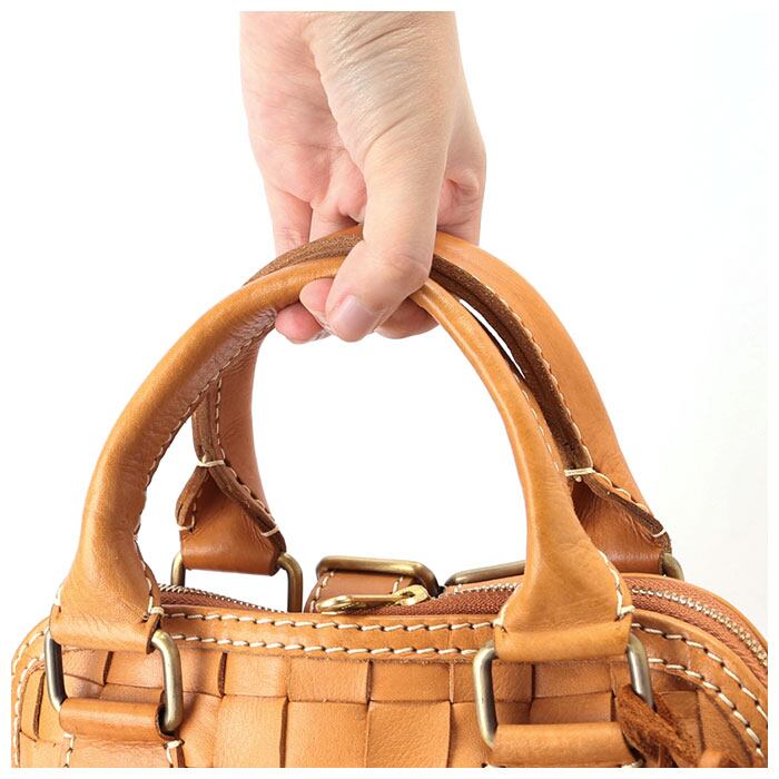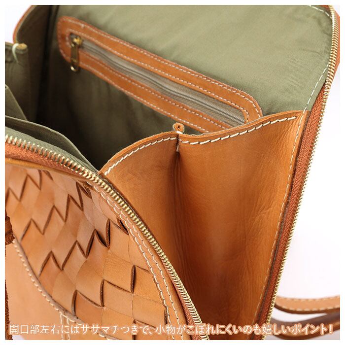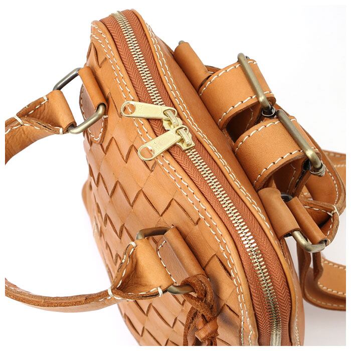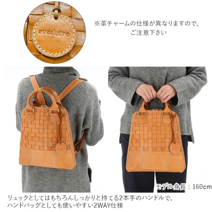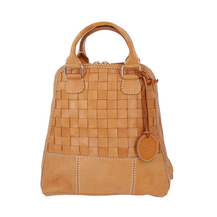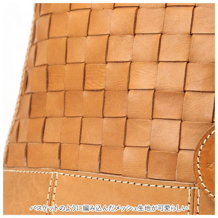 ・リュック本体全てに本格ナチュラルレザー素材を使用し、バスケットのように編み込んだメッシュ生地が可愛らしい、手作り感あふれるラウンド2WAYリュック。