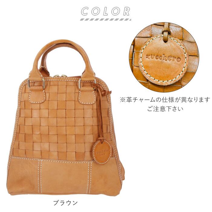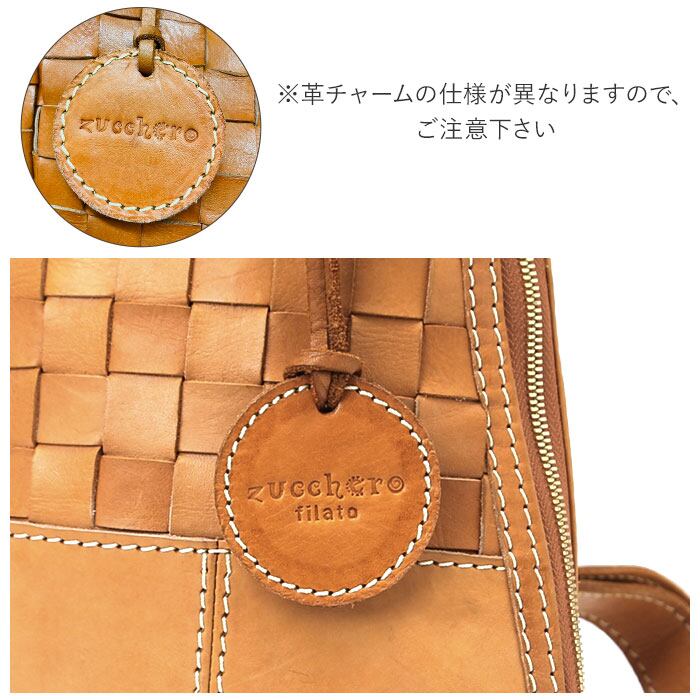 ・使い込むほどに味わいが増す、本革素材ならではの経年変化も楽しめる。「zucchero」のロゴが刻印された、本体と同じ素材のレザータグ付き。
