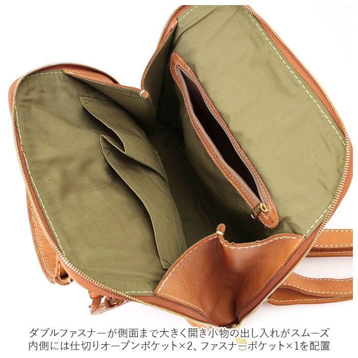 ・開口部はダブルファスナーが側面まで大きく開き、小物の出し入れがスムーズ。左右にはササマチを設けて、小物がこぼれにくいのも嬉しいポイント!