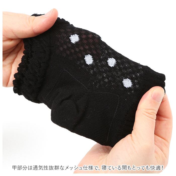 ・足首部分は圧迫感のないふわふわ仕上げ、甲部分は通気性抜群なメッシュ仕様で、寝ている間もとっても快適!